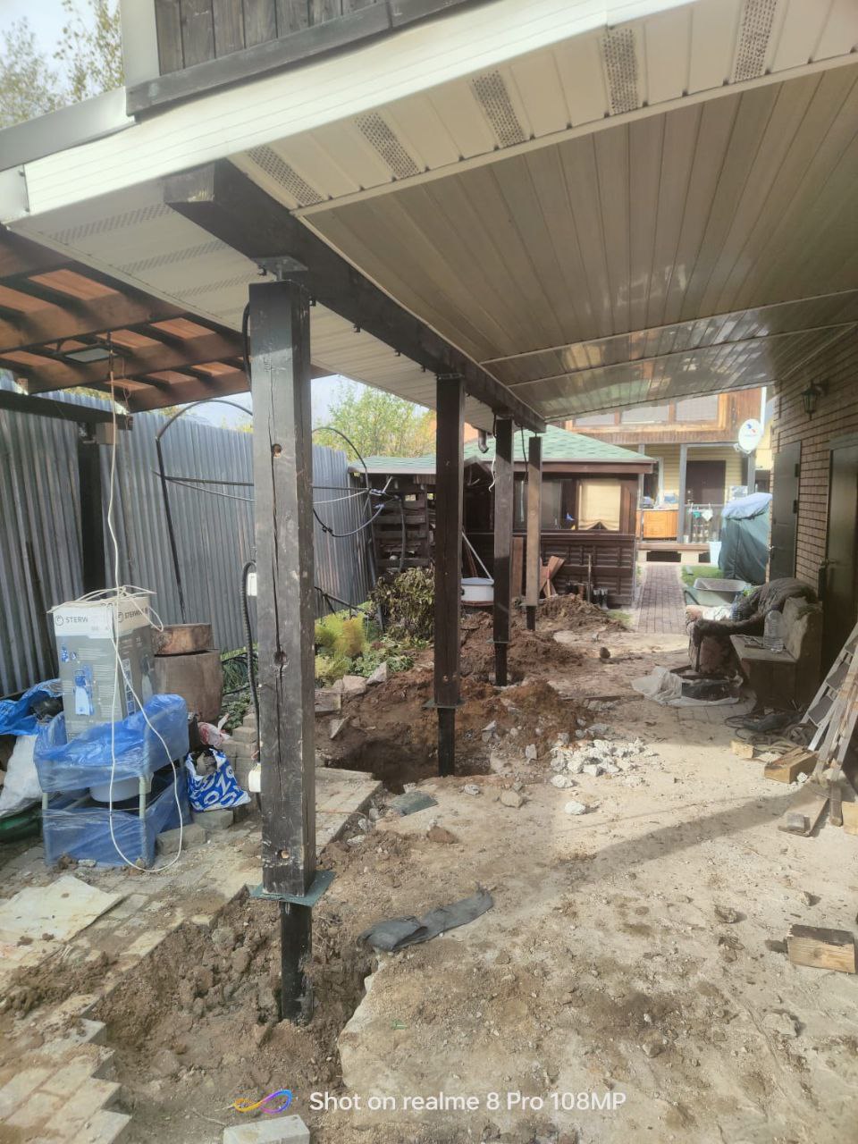 —Выдавило тумбы под опорами навеса - заменили на винтовые сваи